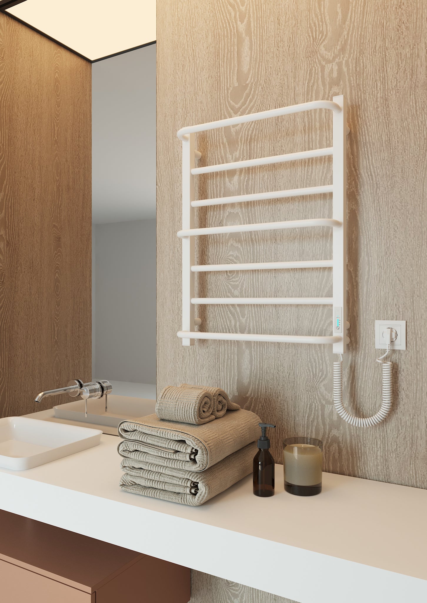 Додаткова опція прихованого монтажу робить вигляд пристрою ще більш мінімалістичним та безпечним. Ще на етапі ремонту його можна змонтувати без зовнішнього шнура живлення. Відсутність звисаючого провода та навіть більше - відсутність розетки на 100% мінімізує будь-які небезпечні ситуації, пов’язані з використанням електропристроїв в приміщенні з високим рівнем вологи, такому як ванна кімната.