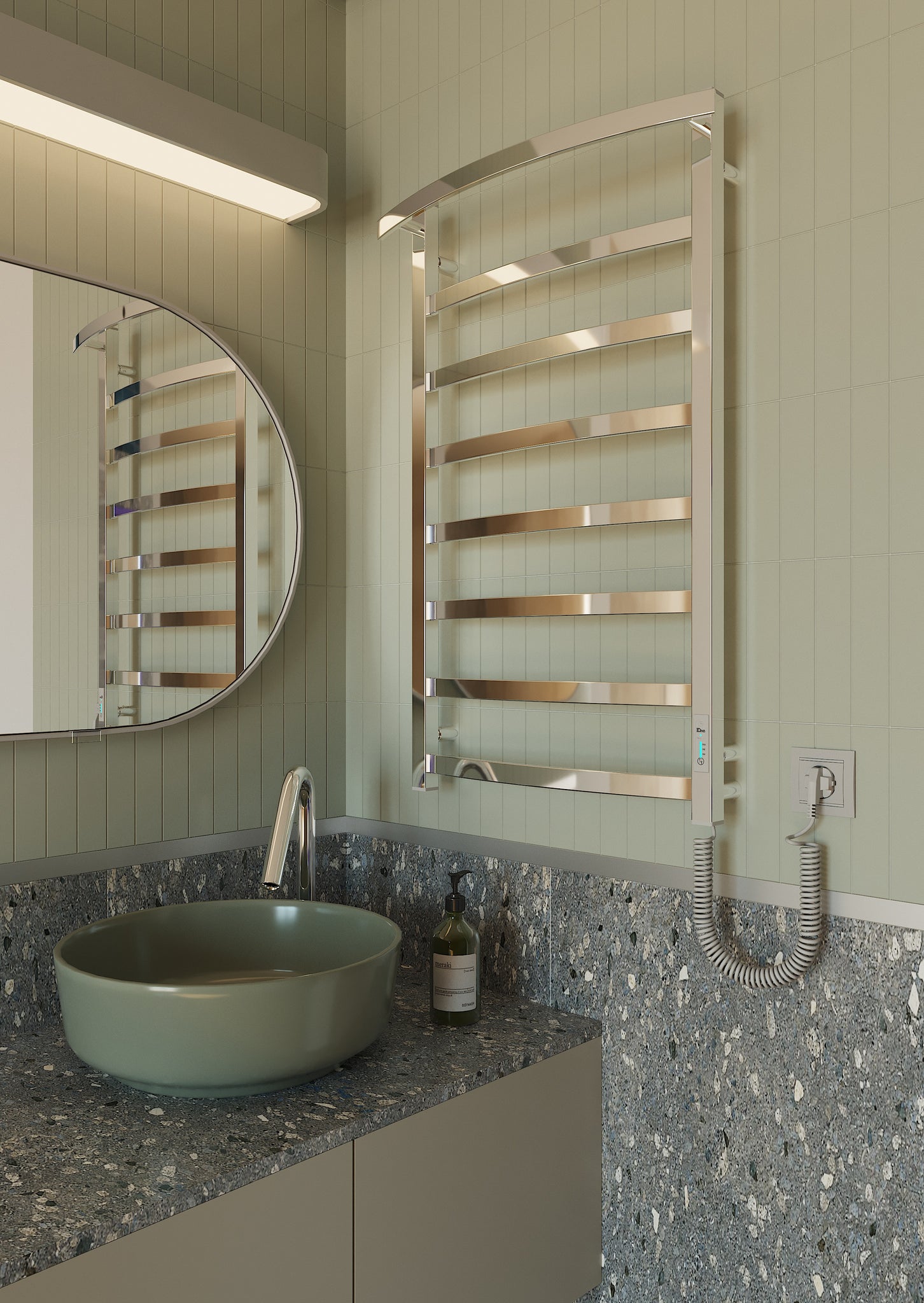 Додаткова опція прихованого монтажу робить вигляд пристрою ще більш мінімалістичним та безпечним. Ще на етапі ремонту його можна змонтувати без зовнішнього шнура живлення. Відсутність звисаючого провода та навіть більше - відсутність розетки на 100% мінімізує будь-які небезпечні ситуації, пов’язані з використанням електропристроїв в приміщенні з високим рівнем вологи, такому як ванна кімната.