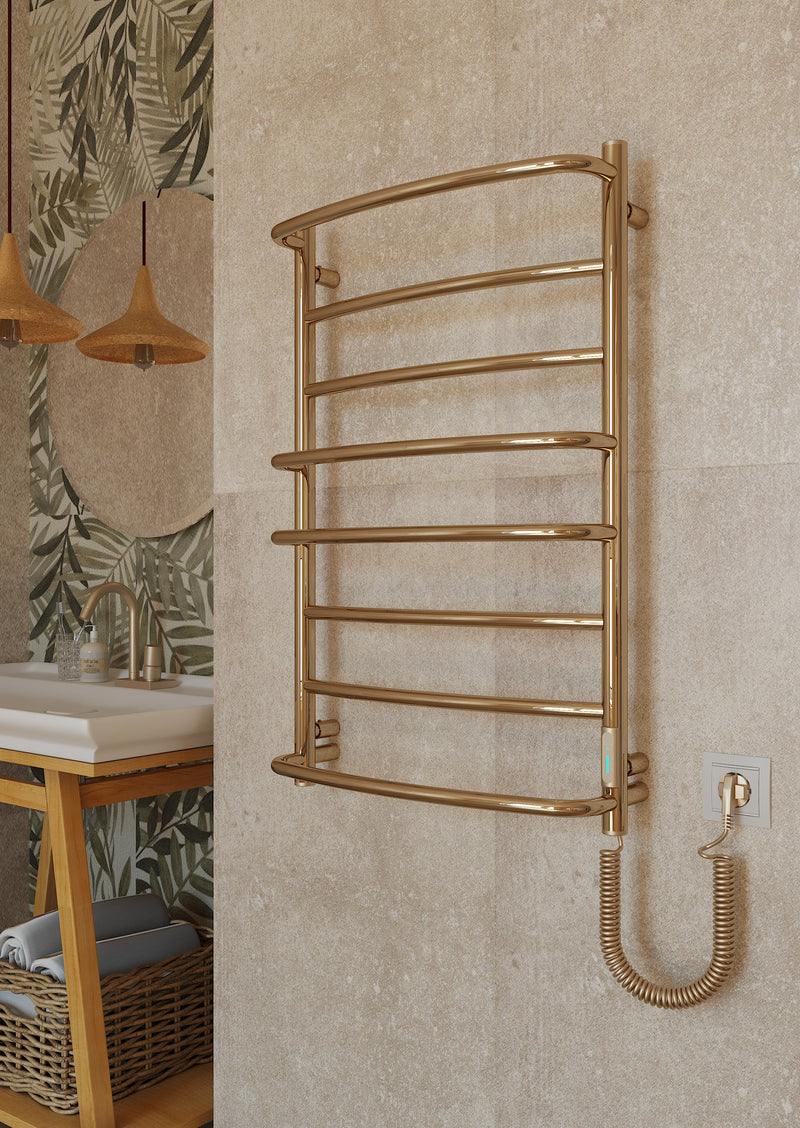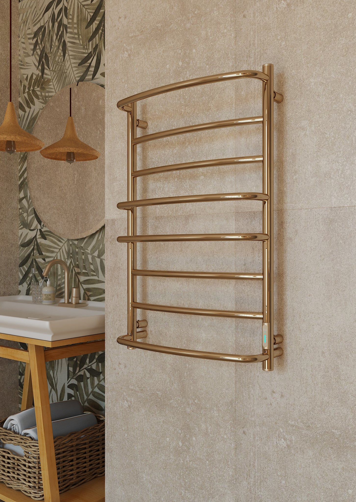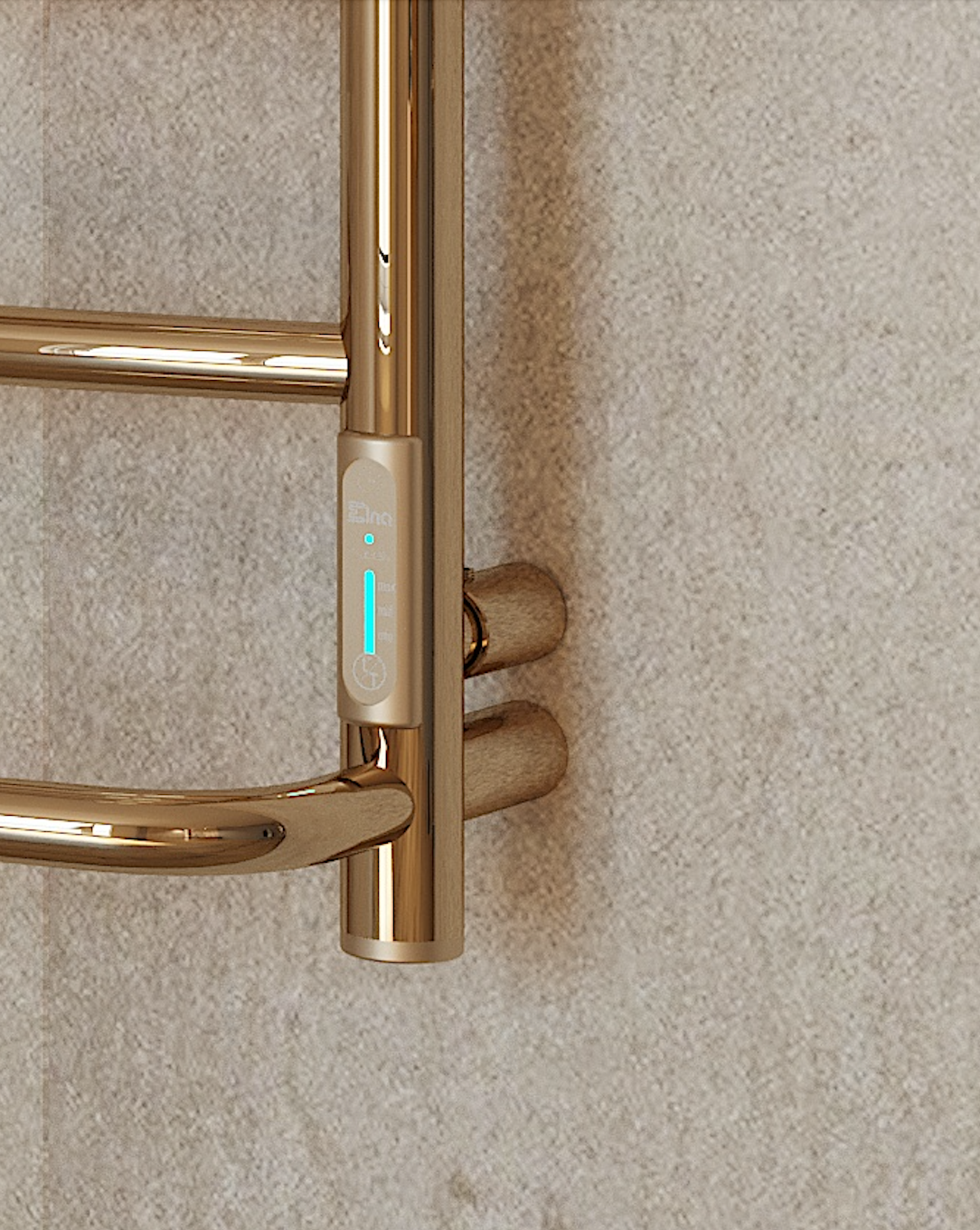 Слідуючи за світовими трендами в дизайні інтер'єру, підприємством Елна-Сервіс створена рушникосушарка з красивим блискучим золотим покриттям для клієнтів, які надають перевагу теплим відтінкам металу. Електрична сушарка для ванної кімнати виготовлена з полерованої нержавіючої сталі, а її поверхня позолочена методом нідрид титанового напилення. Ідеально позолочене покриття зберігає свої технічні характеристики протягом десятків років, а дзеркальна поверхня пристрою з вишуканим золотим відтінком підкреслить розкішну атмосферу інтер’єру ванної кімнати. Полиця дозволяє зручно зберігати рушники у ванній кімнаті.